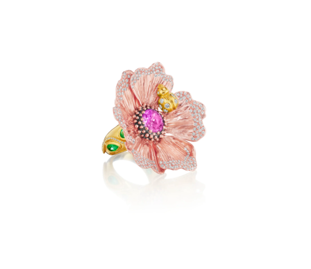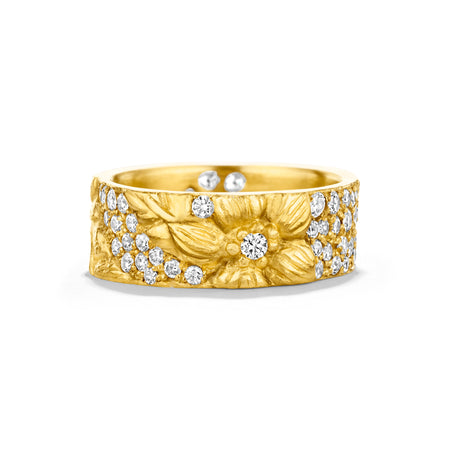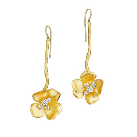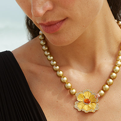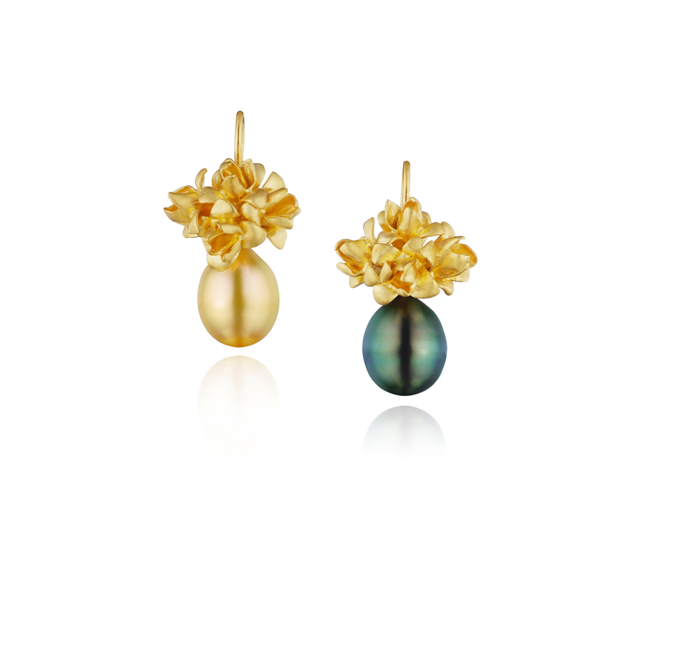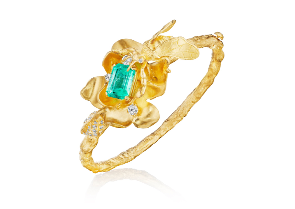 In her studio, Susan’s creative visions are realized in earrings, necklaces, rings, and bracelets that feature whimsical takes on flora, fauna, and more. Using an ancient wax modeling process, each piece begins with hand carving wax models and then sculpting metal castings through several iterations towards a finished piece. The results are finely detailed to replicate what often can only be found in nature, such as the soft curves of flower petals or the delicate wings of a bee. Each piece is made of spectacular 22-karat gold and also meets eco-conscious standards,including the use of recycled gold and fairtrade certified gemstones.
